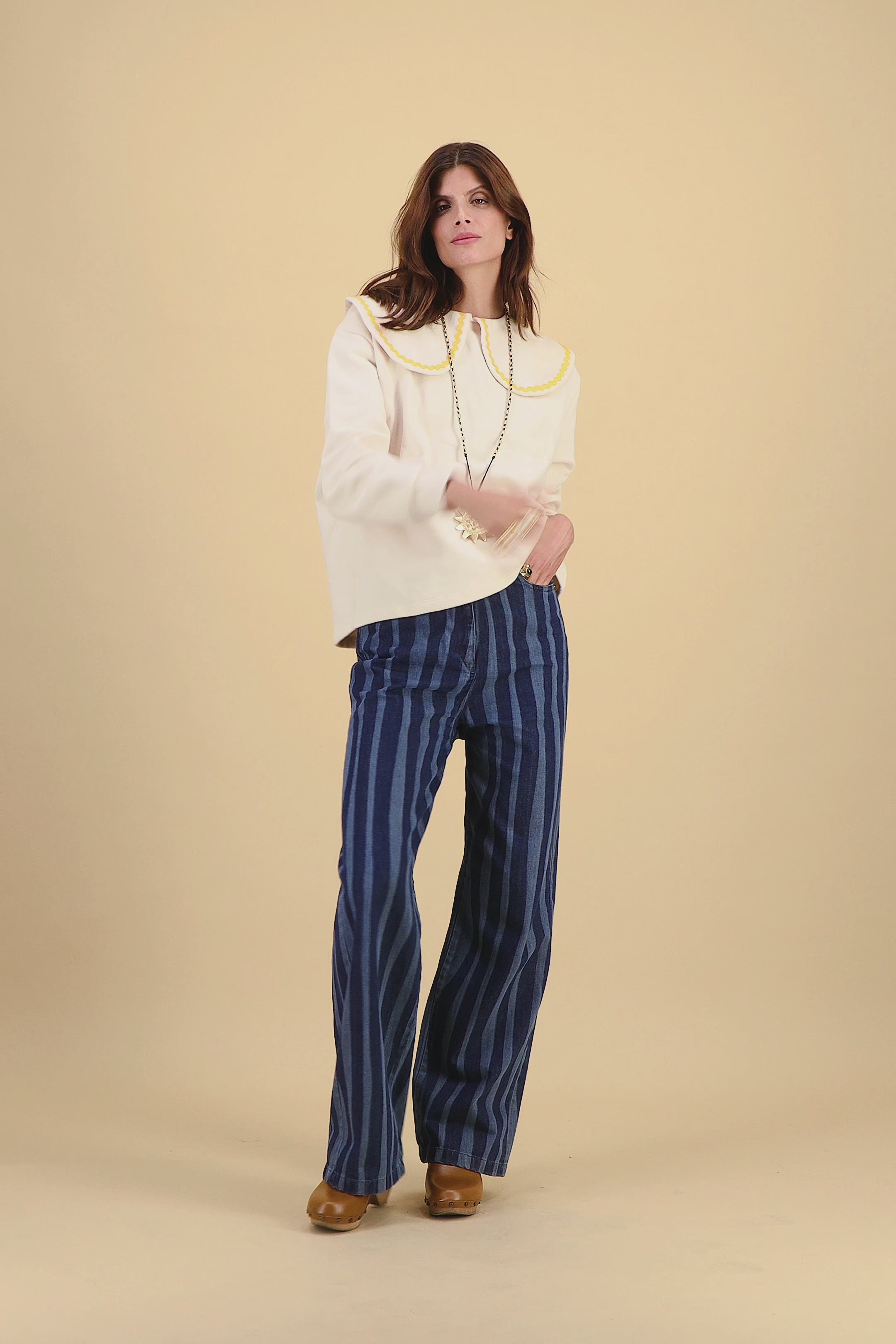 Sweatshirt en molleton doux, orné d’un large col festonné avec galon contrastant. Un bouton dans le dos permet de fermer le col avec élégance. Sa coupe droite et son toucher confortable en font une pièce à la fois féminine et casual. Notre mannequin porte une taille 36.